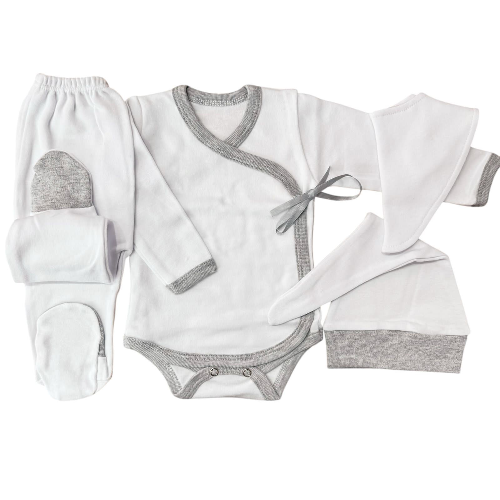 Un ajuar de 4 piezas con body cruzado y cinta, pensado para los primeros meses del bebé. Su diseño con broches metálicos y cintas laterales permite vestirlo fácilmente sin pasar la prenda por la cabeza, ofreciendo practicidad y suavidad en cada cambio de ropa.