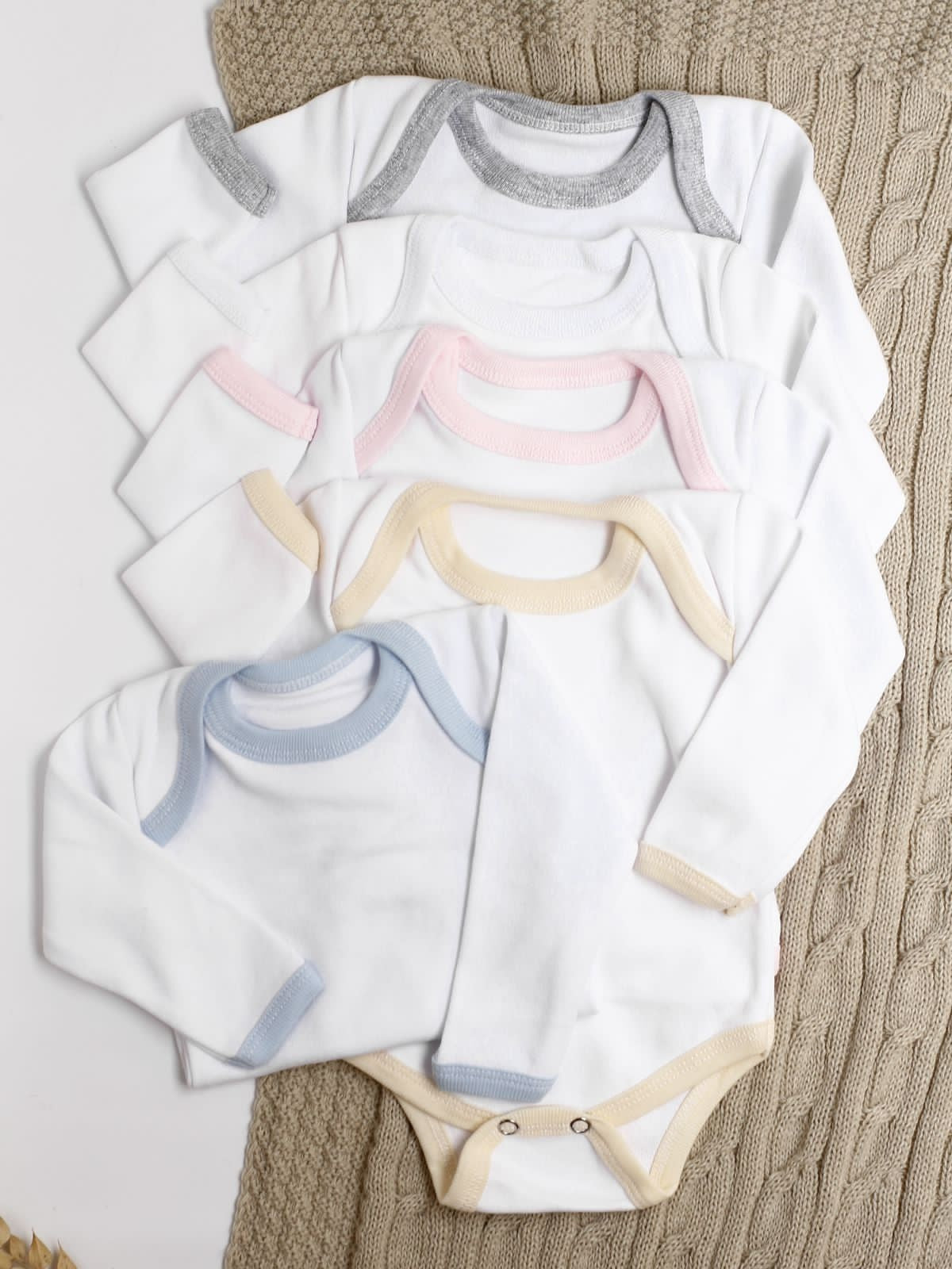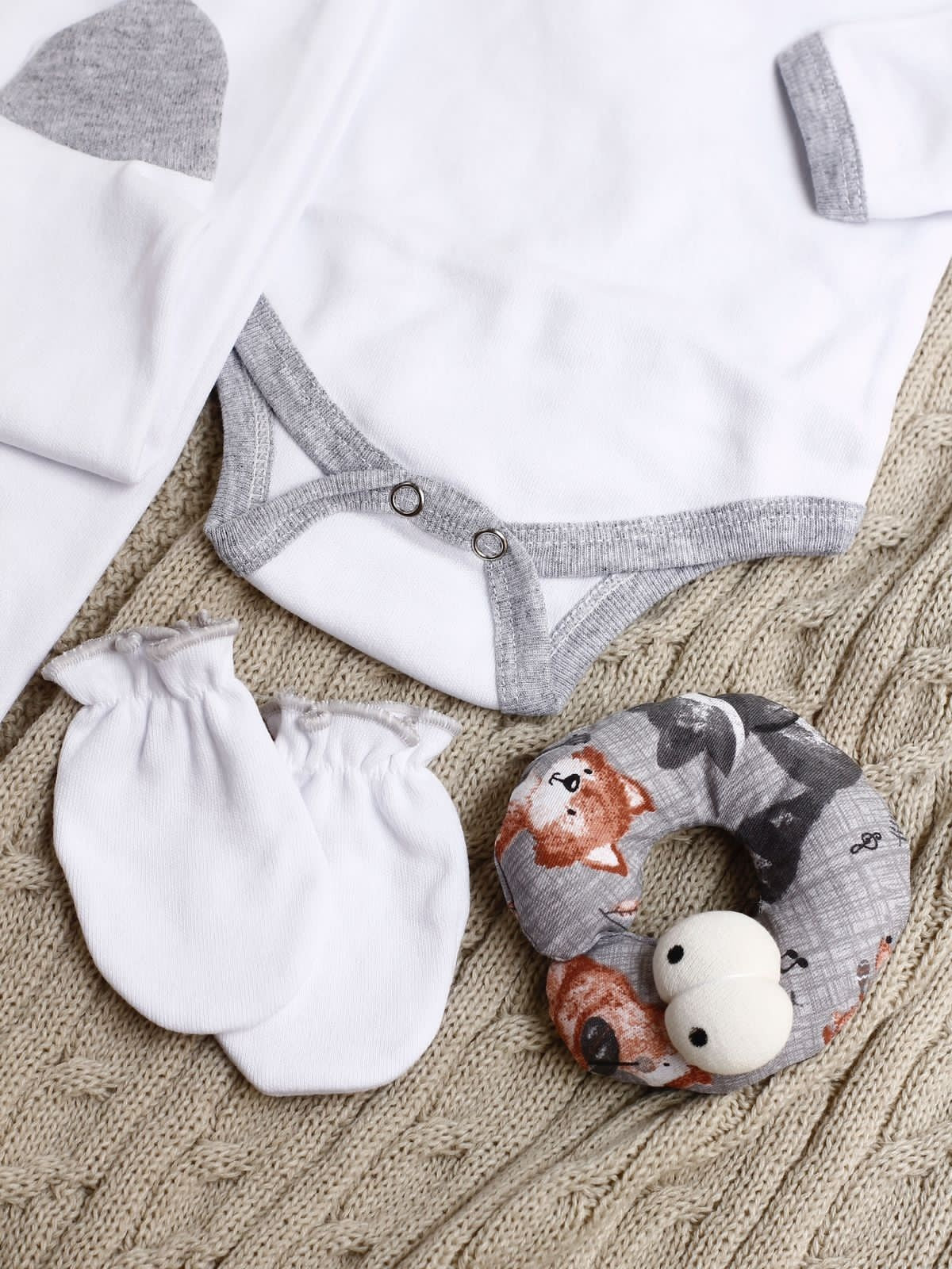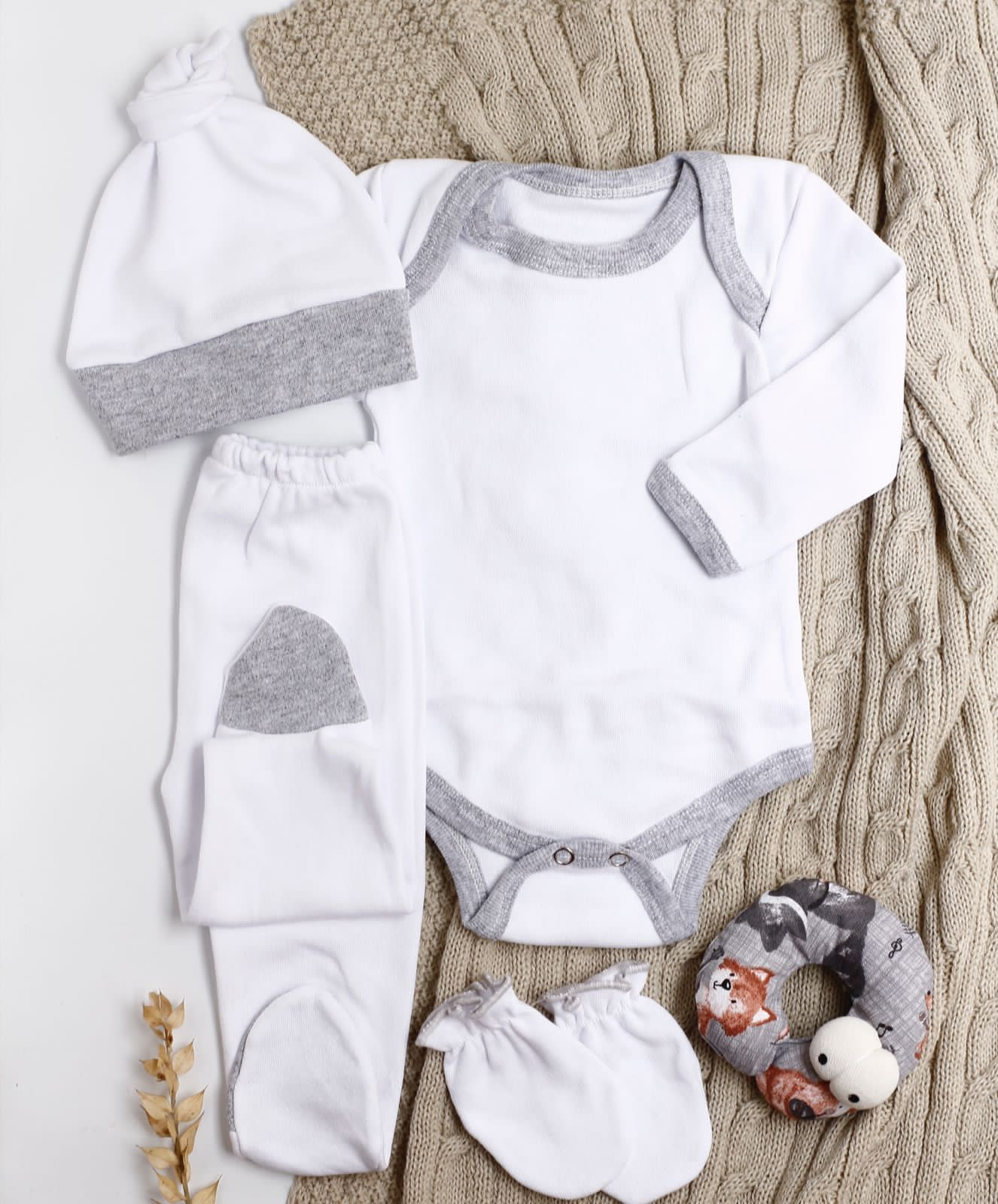 Un ajuar de 4 piezas con body americano liso, diseñado para acompañar al bebé en sus primeros meses. Su estilo con broches metálicos en la parte delantera facilita los cambios de ropa, aportando comodidad y practicidad en cada uso.