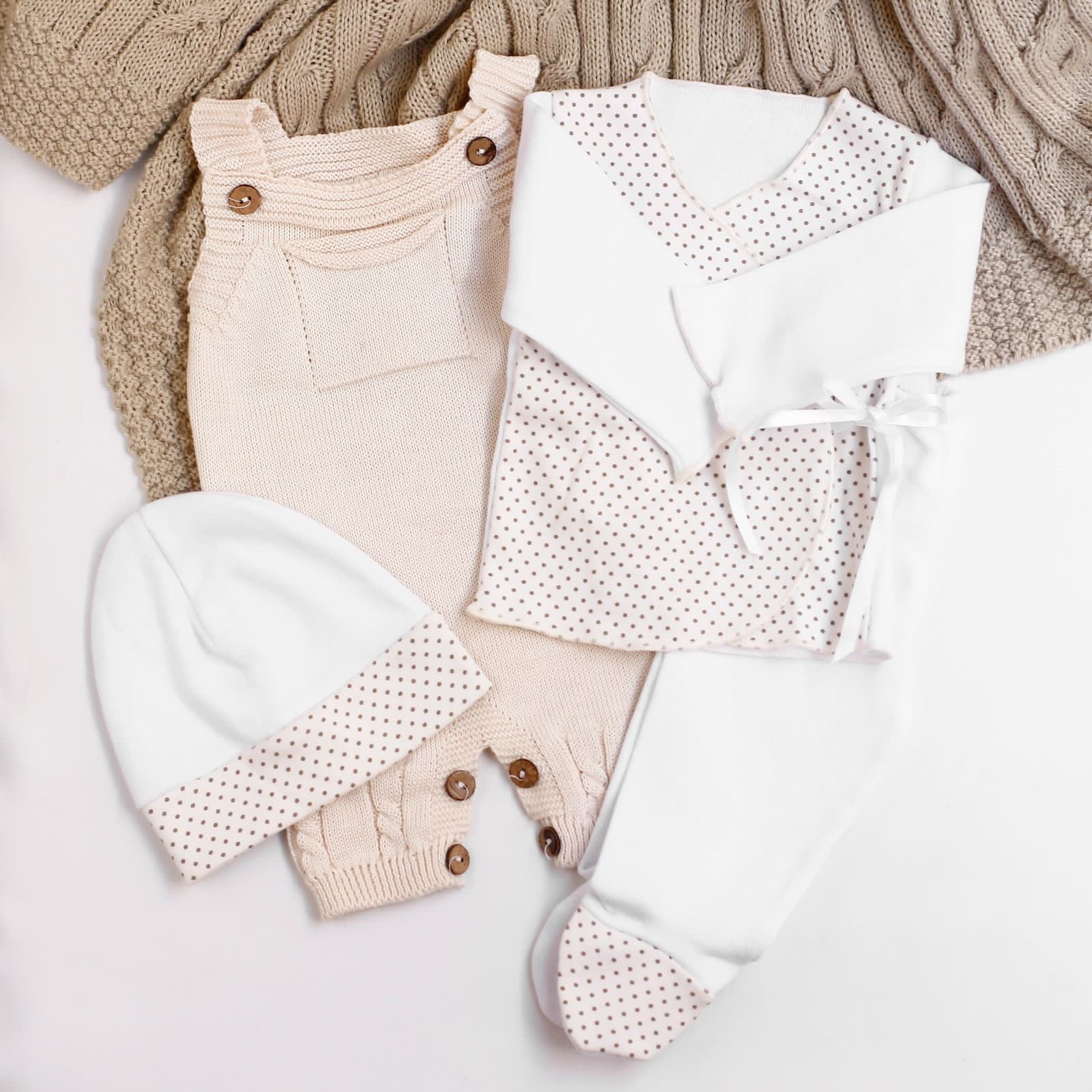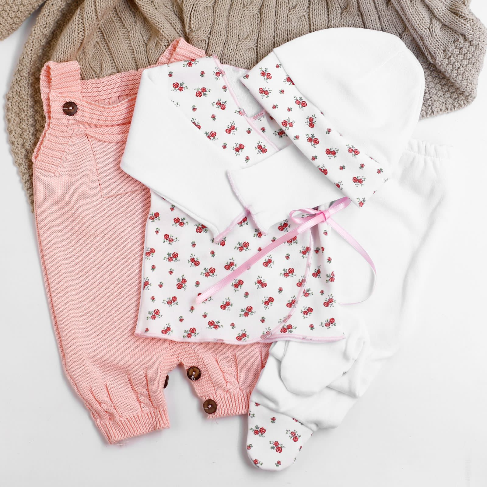 Un ajuar de 4 piezas con batita de cinta, diseñado para brindar practicidad en los primeros días del bebé. Su abertura frontal con cintas facilita el cambio de ropa sin necesidad de pasar la prenda por la cabeza, aportando comodidad y cuidado extra en cada uso.