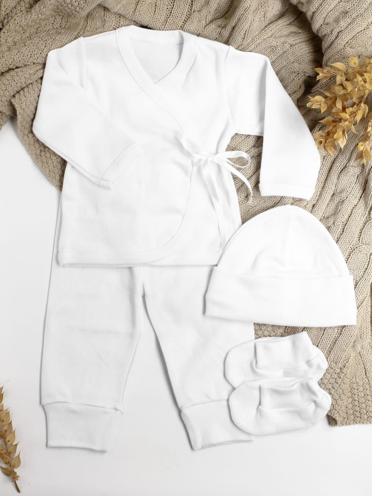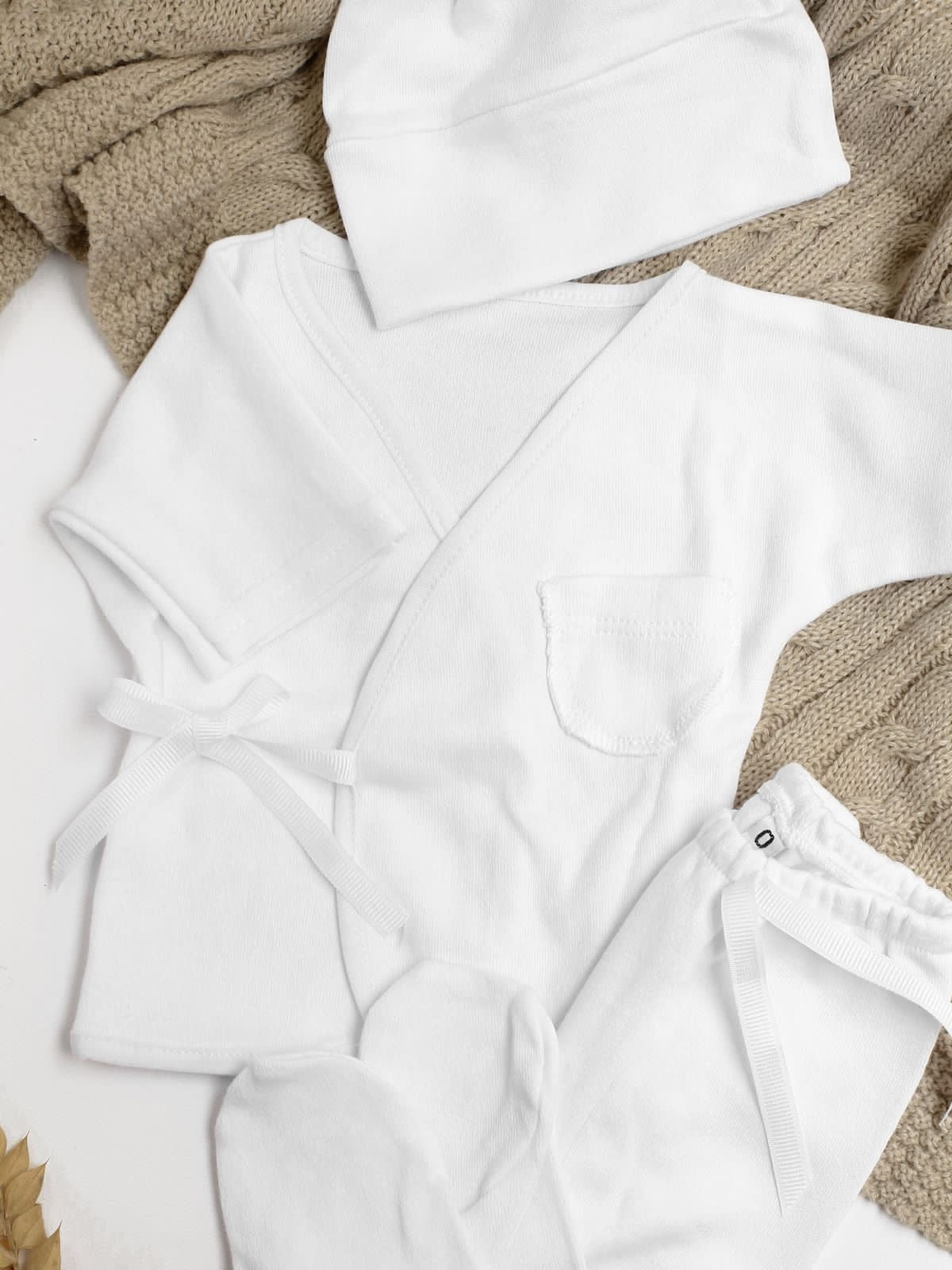 📦 Incluye 4 piezas: bata con cinta, manoplas o escarpines, babucha y gorrito. 👶 Talle único hasta 5kg (dependiendo de cada bebé). ⚪ Color disponible: blanco clásico.