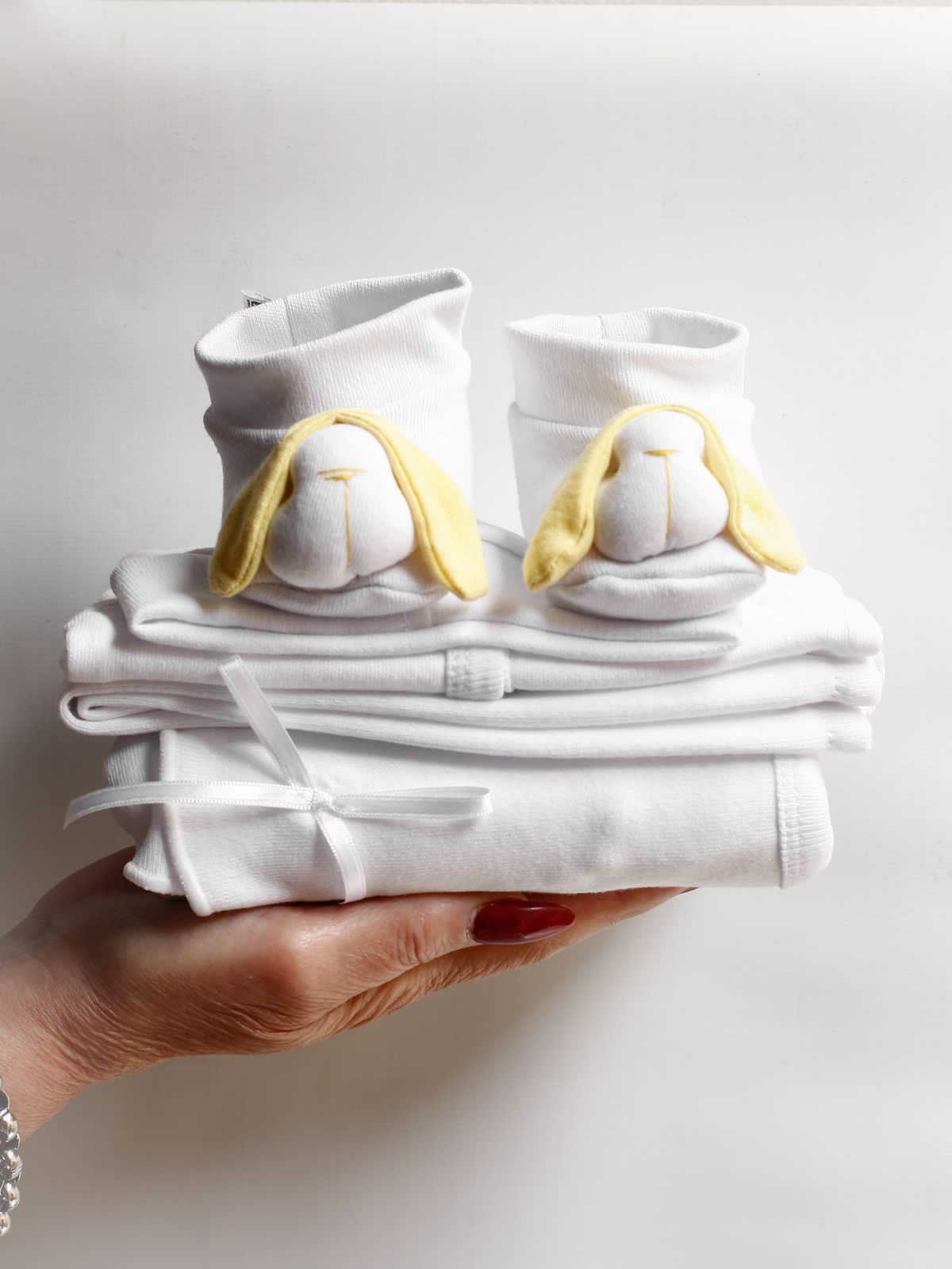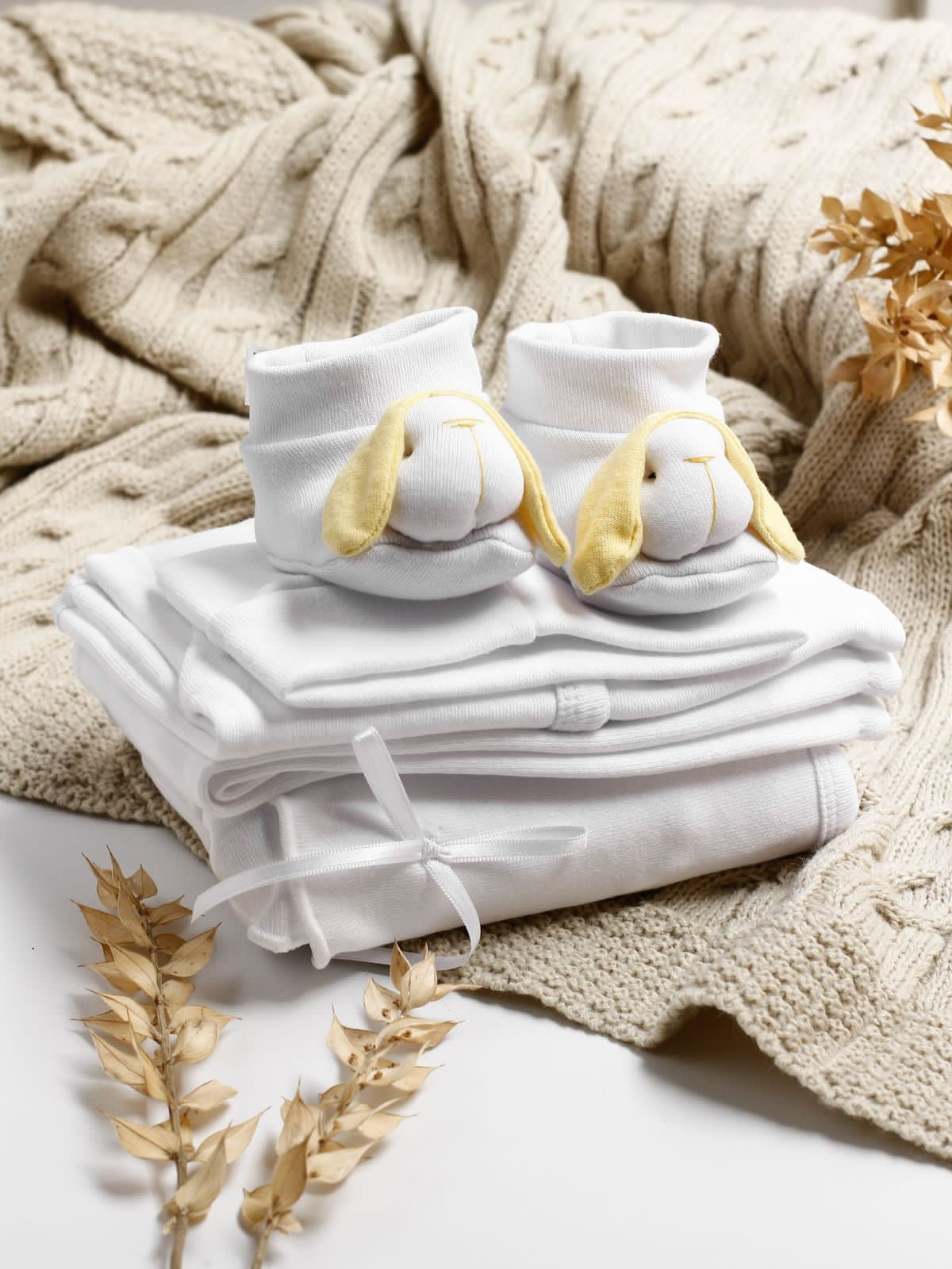 El ajuar clínico con cinta es ideal para los primeros días del bebé. Sus prendas básicas y delicadas están confeccionadas en algodón hipoalergénico, suave y seguro para la piel más sensible.