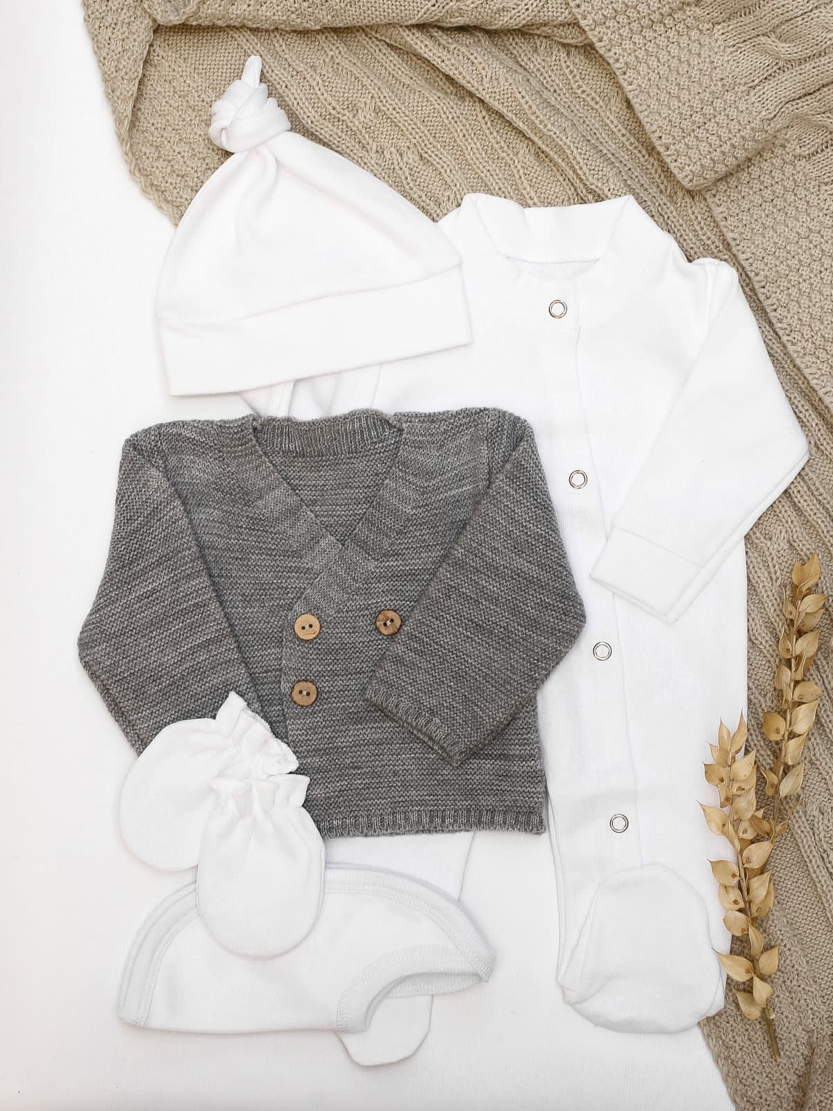 📦 Incluye 4 piezas: enterito, gorrito, par de manoplas y babero. 👶 Talle único: 0 a 3 meses aprox. ⚪ Color disponible: blanco.