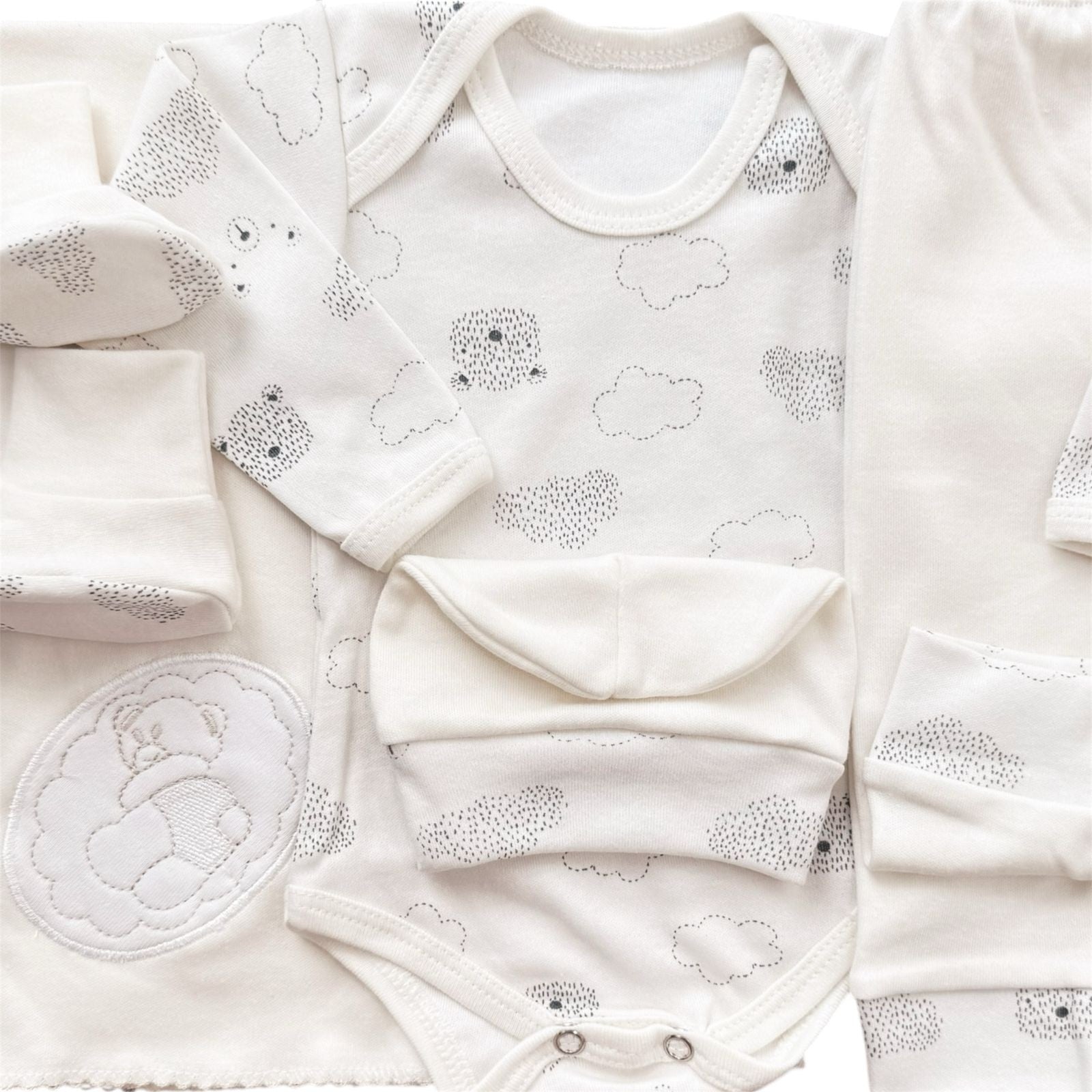 Un ajuar de 5 piezas diseñado para brindar comodidad y practicidad en los primeros días del bebé. El body con cuello americano facilita los cambios de ropa y resulta muy práctico ante pequeños accidentes, mientras que cada prenda está confeccionada en algodón Pima hipoalergénico, suave y seguro para la piel sensible del recién nacido.